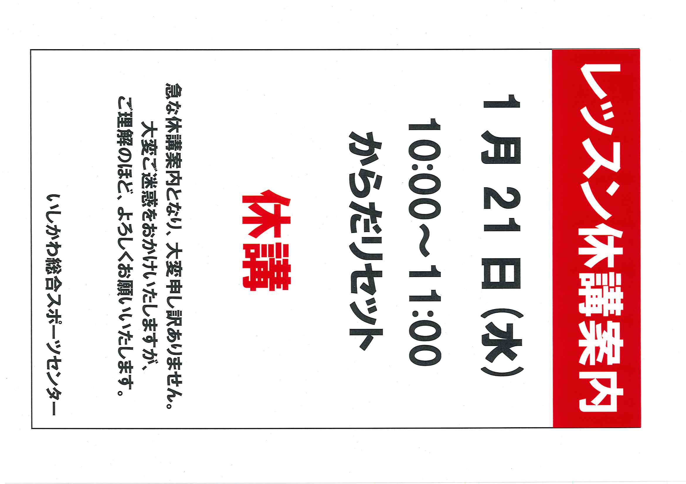【ISCレッスン】 休講のお知らせ 1月21日(水) (01/19)