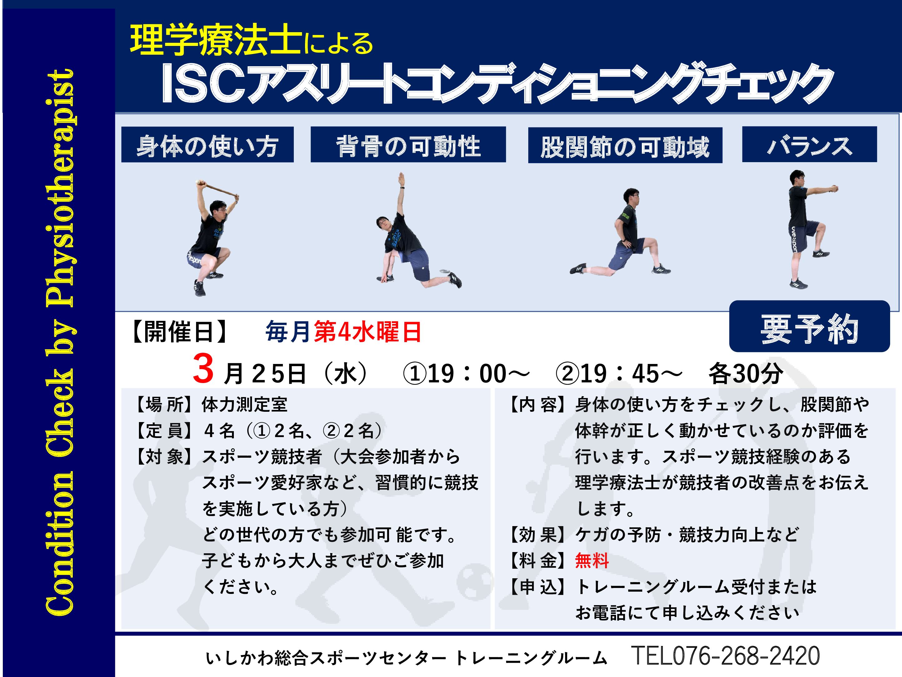 アスリート対象コンディショニングチェック開催のお知らせ【3月25日(水)】 (02/27)