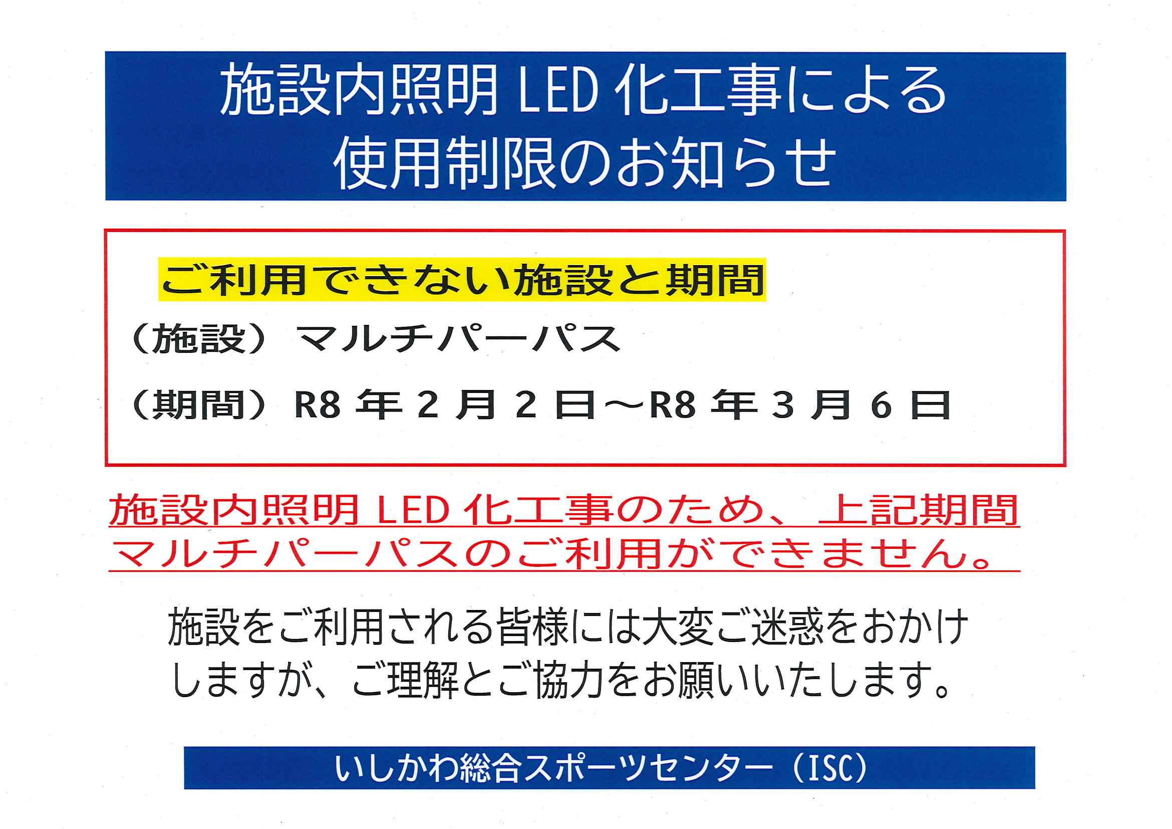 施設内照明LED化工事により、下記の期間マルチパーパスの使用ができなくなります。
