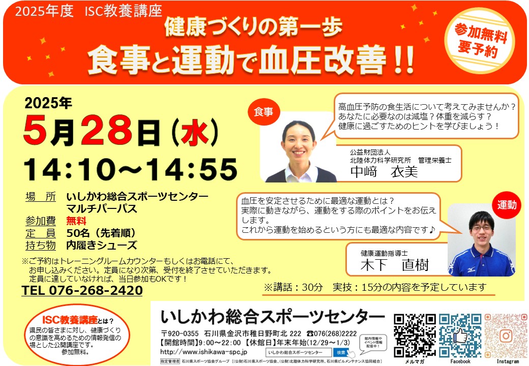~健康づくりの第一歩~ 食事と運動で血圧改善!! みなさまの健康づくりに役立つ情報を発信するISC教養講座 今回は「血圧」についてです 高血圧予防のための食生活や運動について考えてみませんか? これからの人生を健康的に過ごすためのヒントを学びましょう! 50名限定ですのでご予約はお早めに! 皆様のご参加を、心よりお待ちしております 日程:2025年5月28日(水) 14:10~14:55 会場:いしかわ総合スポーツセンター マルチパーパス 参加費:無料 定員:50名 ![]()