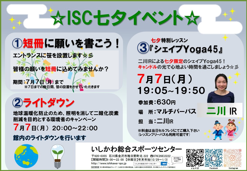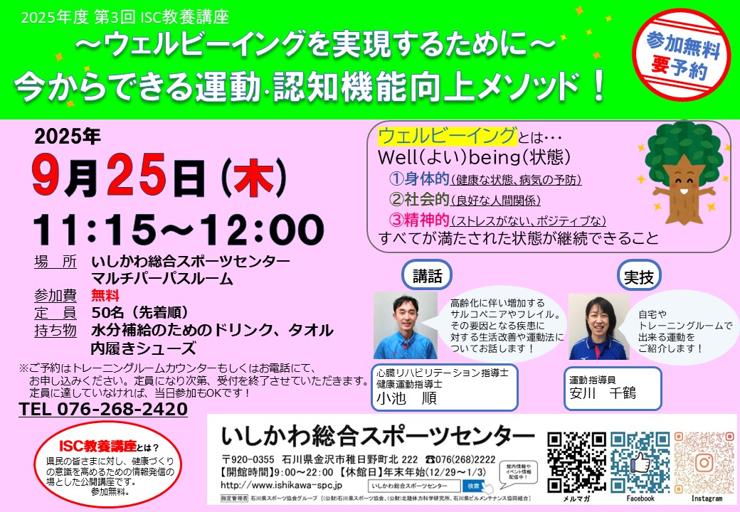 ~ウェルビーイングを実現するために~ 今からできる運動・認知機能向上メソッド! みなさまの健康づくりに役立つ情報を発信するISC教養講座 今回は「運動・認知機能の向上」についてです ウェルビーイング well(よい) being(状態)を継続するために今からできる事を学びましょう! 実技では、自宅やトレーニングルームで出来る運動をご紹介します 50名限定ですのでご予約はお早めに! 皆様のご参加を、心よりお待ちしております 日程:2025年9月25日(木) 11:15~12:00 会場:いしかわ総合スポーツセンター マルチパーパス 参加費:無料 定員:50名 ![]()