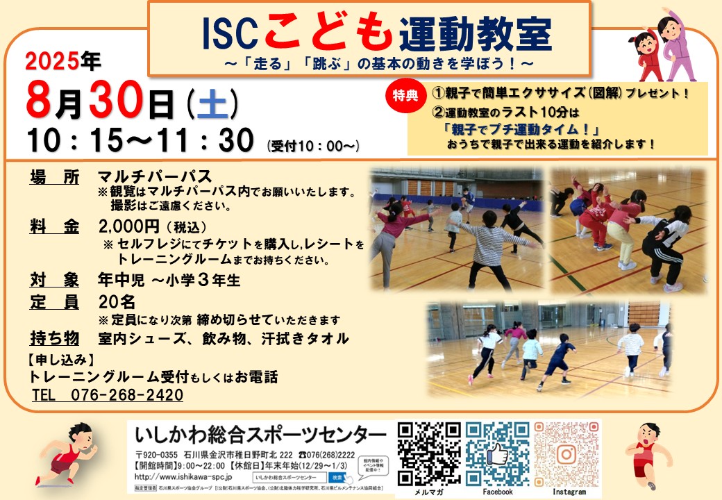 今回は「走る」「跳ぶ」の基本の動きを学びます! 運動教室のラスト10分は「親子でプチ運動タイム」も行います 足が速くなりたい、ジャンプ力を上げたいというお子さま大歓迎です! 是非、この夏の思い出にISCこども運動教室をご活用ください 20名限定ですのでご予約はお早めに! 皆様のご参加を、心よりお待ちしております 日程:2025年8月30日(土) 10:15~11:30 会場:いしかわ総合スポーツセンター マルチパーパス 参加費:2,000円 定員:20名 ![]()