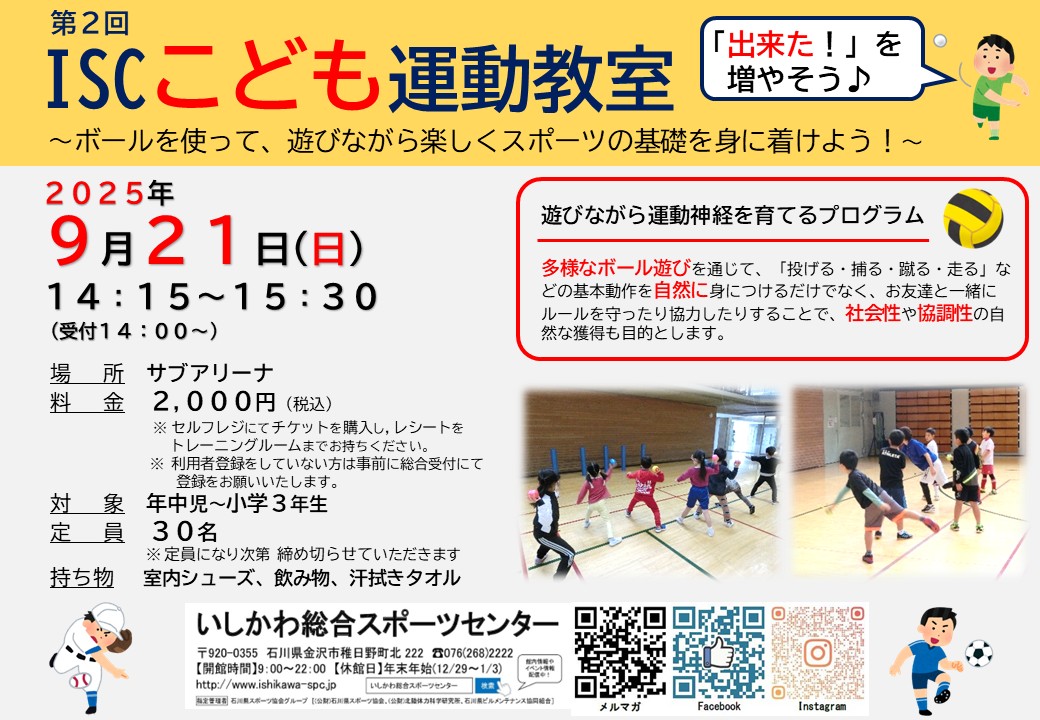 今回はボールを使って、遊びながら楽しくスポーツの基礎を身につけます! お友達と協力することで、社会性や協調性の自然な獲得も! 楽しく運動をしながら、「出来た!」を増やそう 30名限定ですのでご予約はお早めに! 皆様のご参加を、心よりお待ちしております 日程:2025年9月21日(日) 14:15~15:30 会場:いしかわ総合スポーツセンター サブアリーナ 参加費:2,000円 定員:30名 ![]()