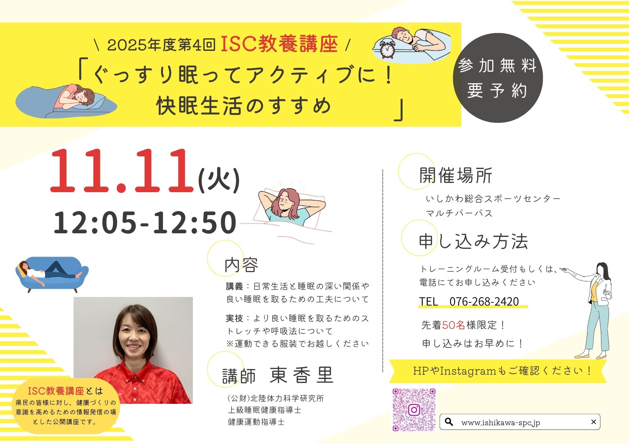 「ぐっすり眠ってアクティブに!快眠生活のすすめ」 みなさまの健康づくりに役立つ情報を発信するISC教養講座 今回は「快眠生活」についてです 日常生活と睡眠の深い関係や良い睡眠をとるためのストレッチ方法等を一緒に学びましょう 50名限定ですのでご予約はお早めに! 皆様のご参加を、心よりお待ちしております 日程:2025年11月11日(火) 12:05~12:50 会場:いしかわ総合スポーツセンター マルチパーパス 参加費:無料 定員:50名 ![]()
