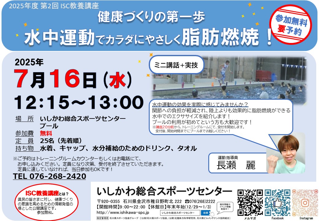 ~健康づくりの第一歩~ 水中運動でカラダにやさしく脂肪燃焼! みなさまの健康づくりに役立つ情報を発信するISC教養講座 今回は「水中運動」についてです 水中運動の効果を実際に感じてみませんか? これからの人生を楽しく過ごすためのヒントを学びましょう! 25名限定ですのでご予約はお早めに! 皆様のご参加を、心よりお待ちしております 日程:2025年7月16日(水) 12:15~13:00 会場:いしかわ総合スポーツセンター プール 参加費:無料 定員:25名