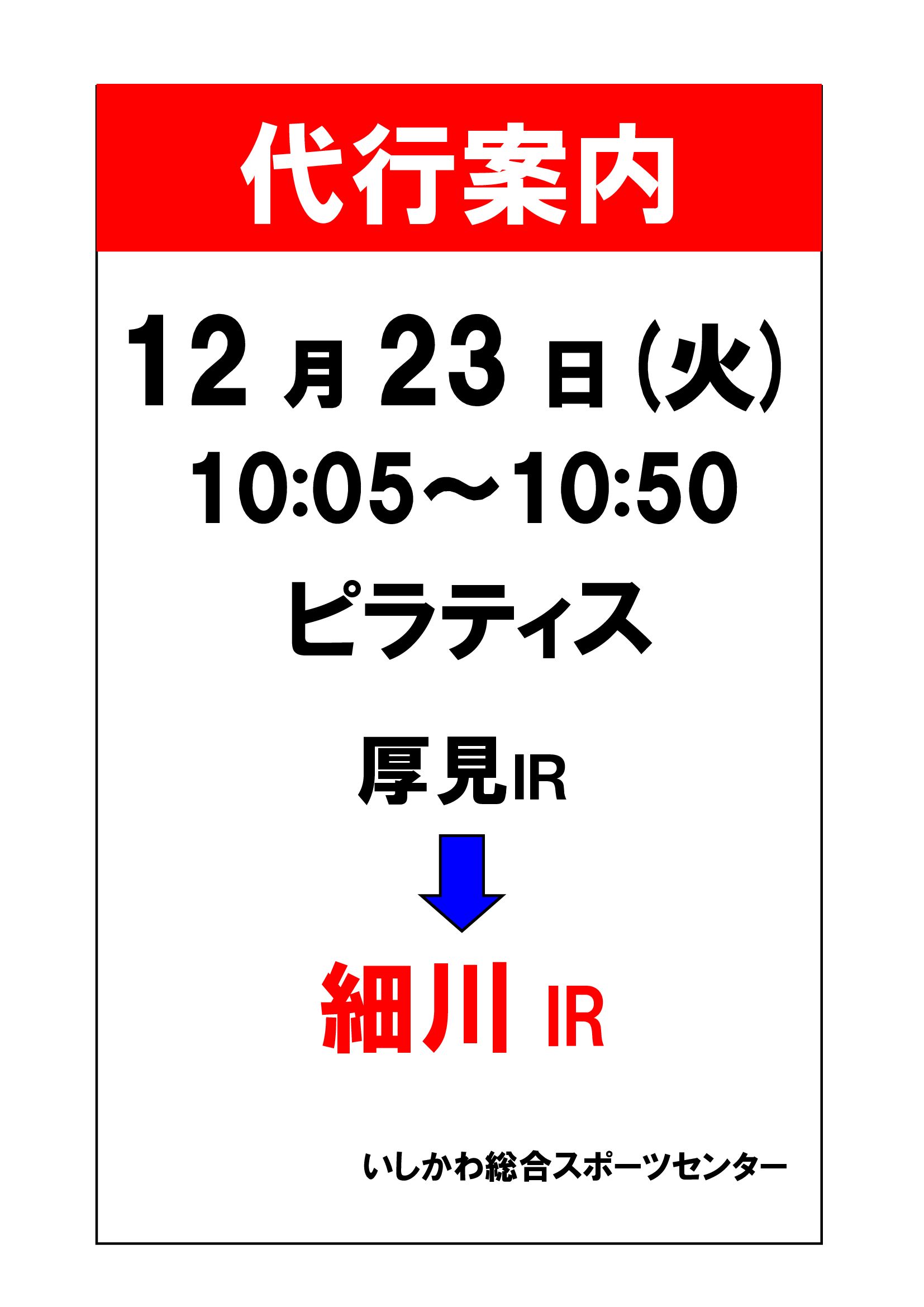 【ISCレッスン】 12月23日(火) インストラクター代行のお知らせ (12/16)