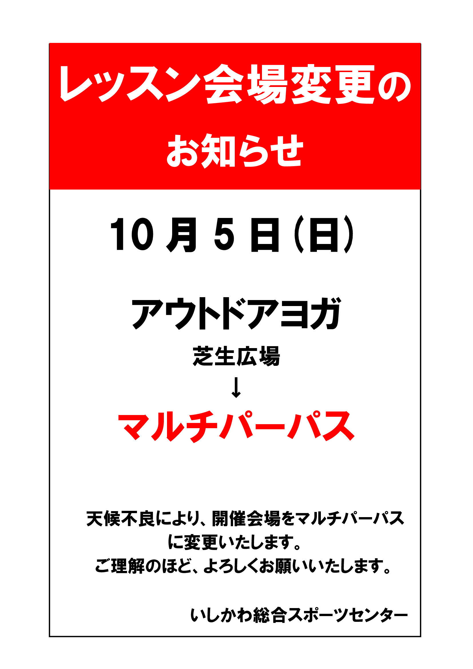 【10月5日(日)アウトドアヨガのレッスン会場変更について】 (10/05)