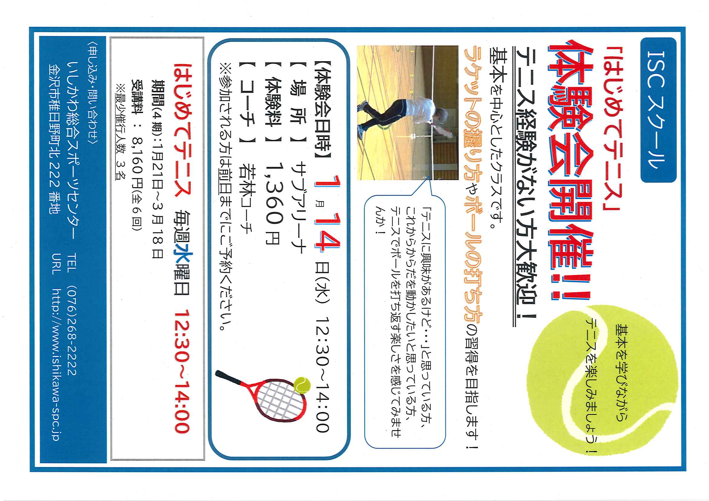 そこで今回は、「はじめてテニス」の体験会を開催します!! 体験会日時 1月14日(水) 12:30~14:00 場所 サブアリーナ 体験料 1,360円 ※参加される方は前日までにご予約ください。 基本を中心としたクラスですので、テニス経験がない方大歓迎 今、何か運動を始めてみようか悩んでいる方やテニスに少し興味がある方、ぜひこの機会に一度体験してみてはいかがでしょうか! ![]() 「はじめてテニス」体験会 |