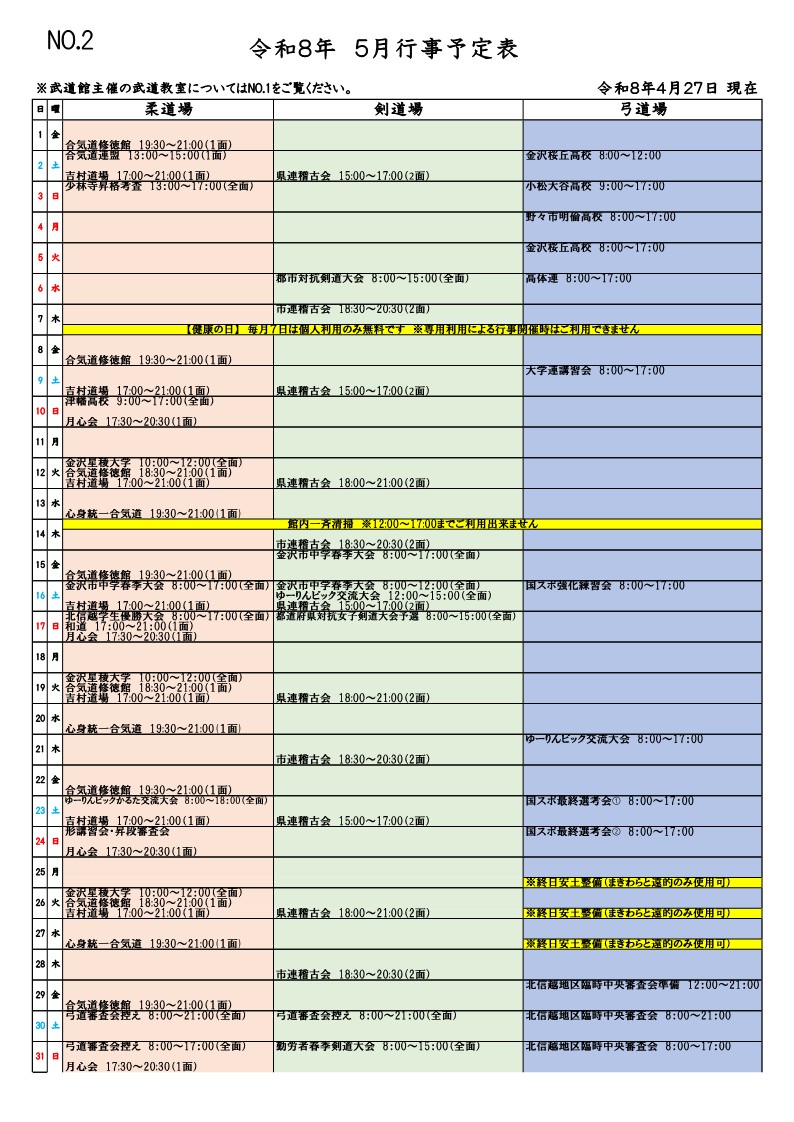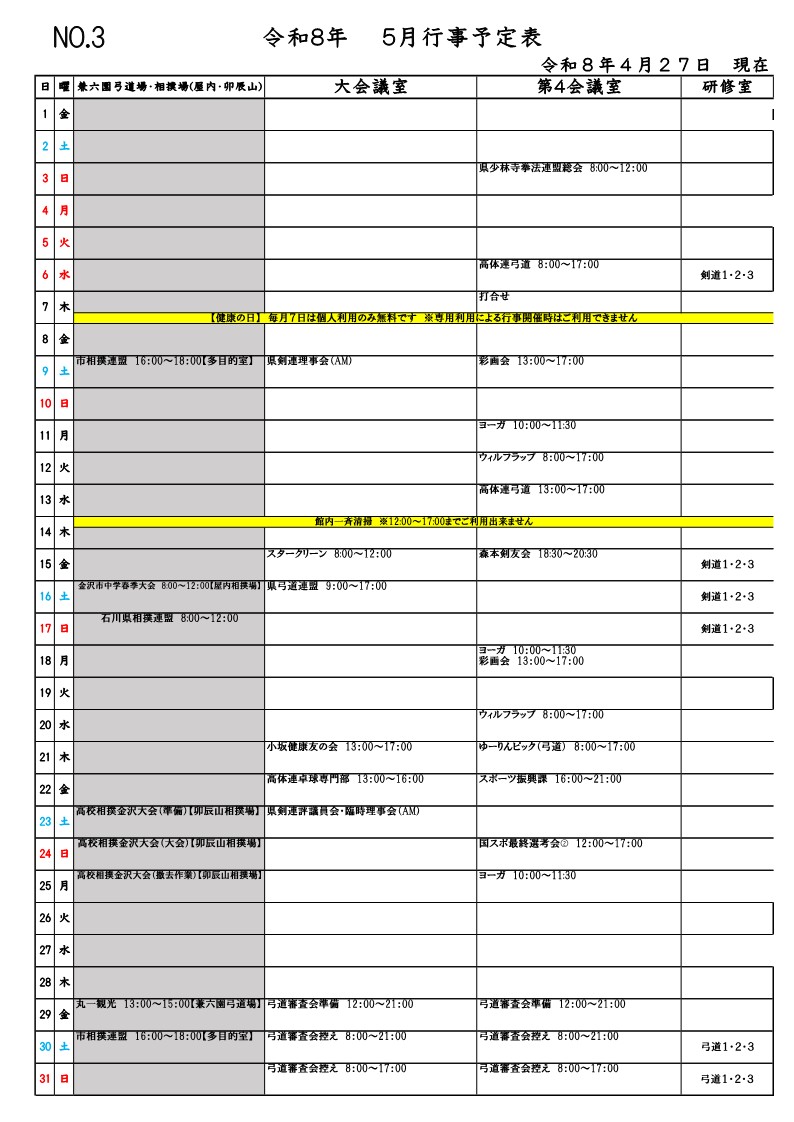 最新の予約状況については当館まで直接お問い合わせください。 NO.1 各武道教室、定例稽古 ![]() 72 NO.2 各道場(柔道場・剣道場・弓道場) ![]() NO.3 兼六園弓道場、相撲場(屋内・卯辰山)、各会議室 ![]()