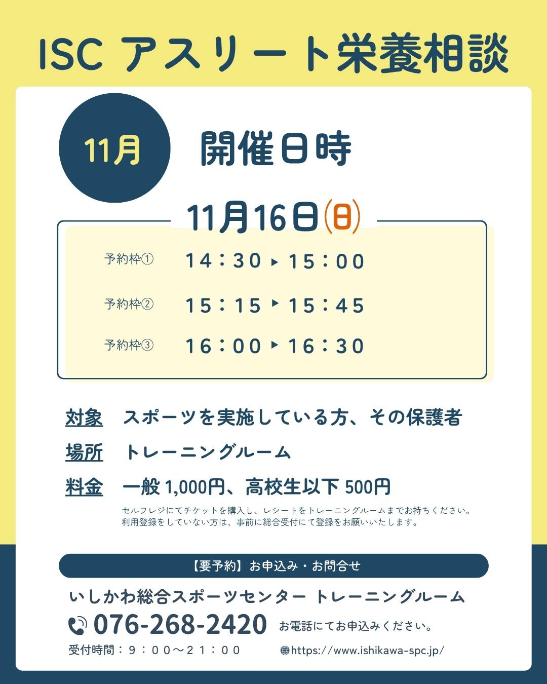 アスリート栄養相談のお知らせ【11月16日(日)】 (10/19)