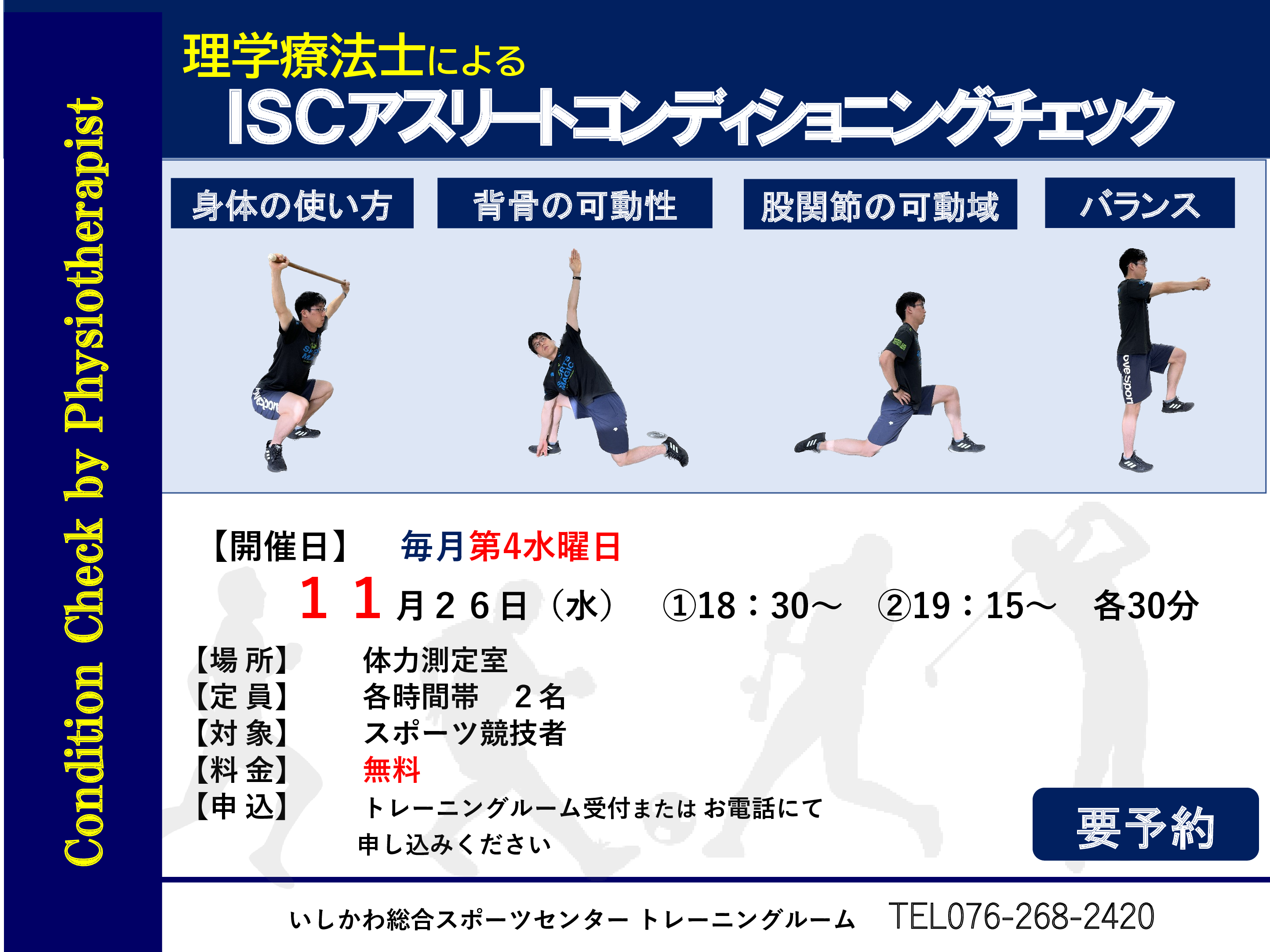 アスリート対象コンディショニングチェック開催のお知らせ【11月26日(水)】 (10/25)