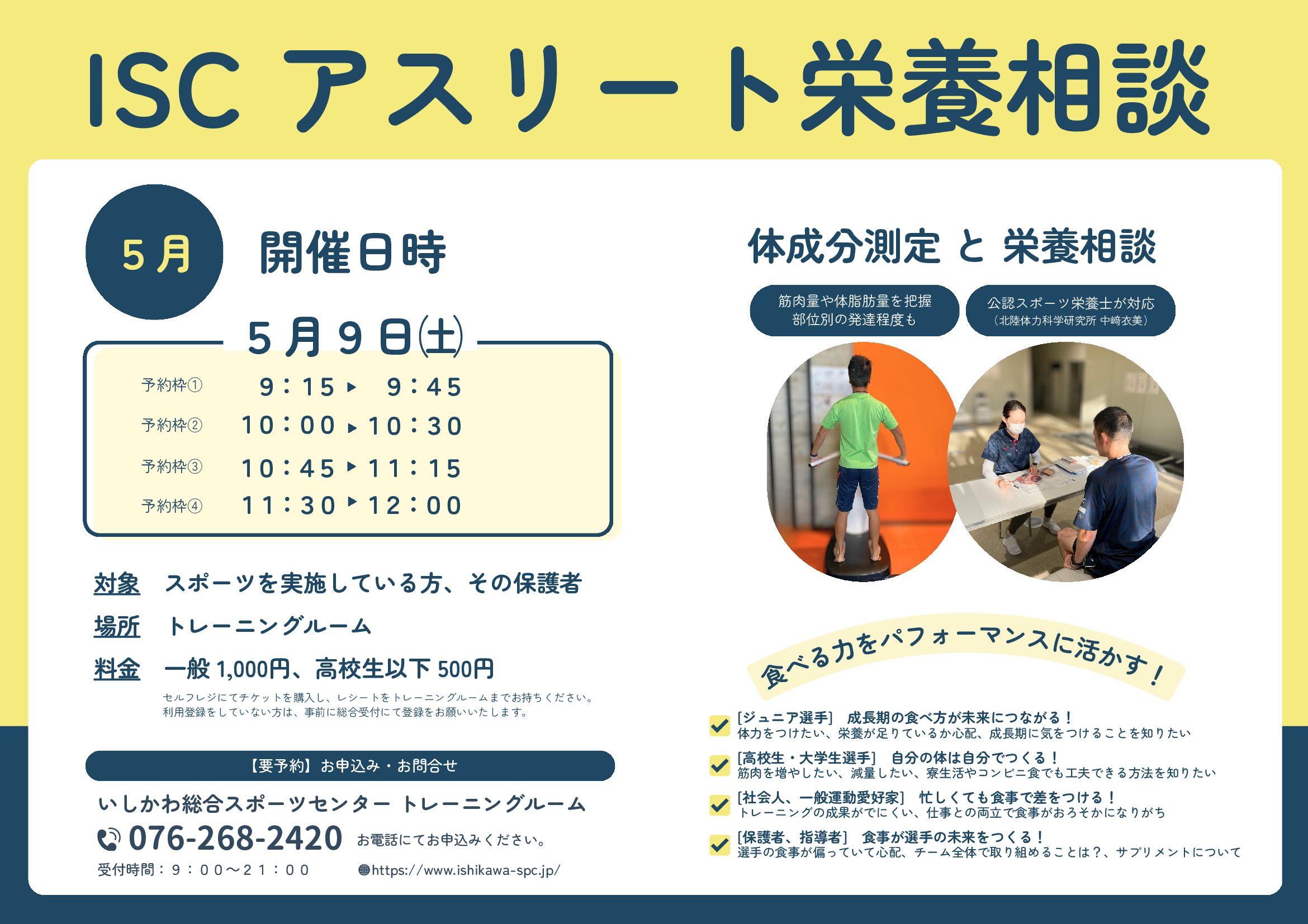 アスリート栄養相談のお知らせ【5月9(土)】 (04/05)