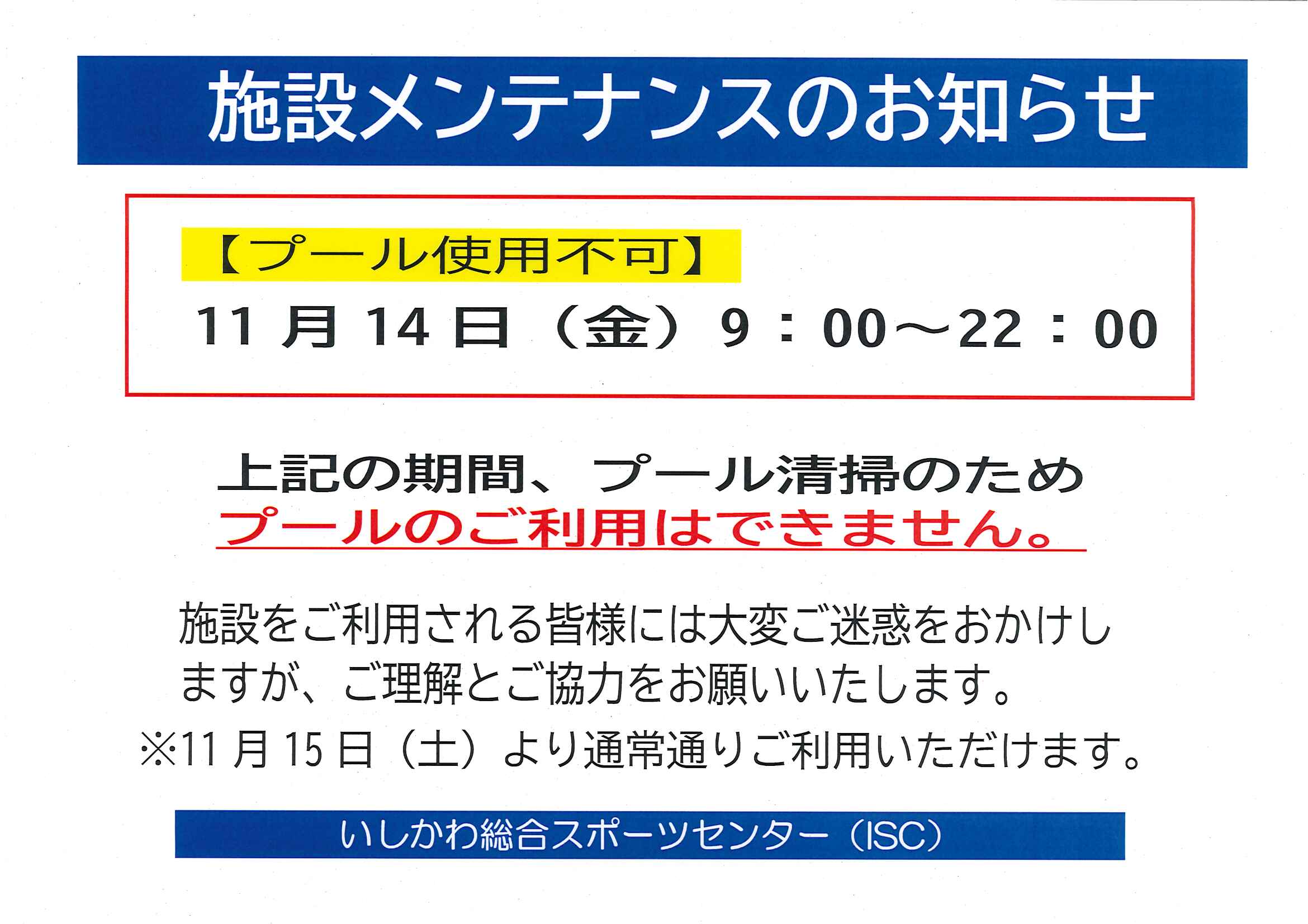 日頃より「いしかわ総合スポーツセンター」をご利用いただきありがとうございます。