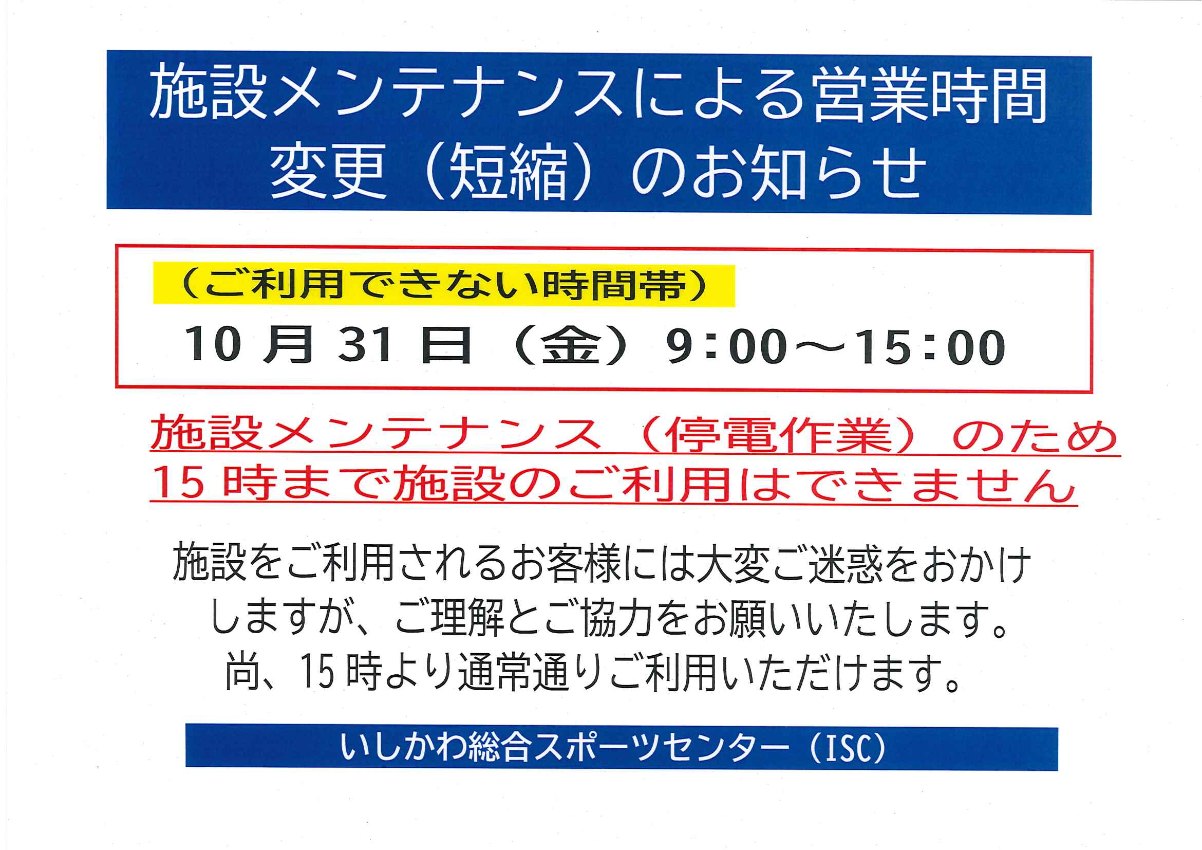 10/31(金)施設メンテナンスによる営業時間変更(短縮)のお知らせ! (10/07)