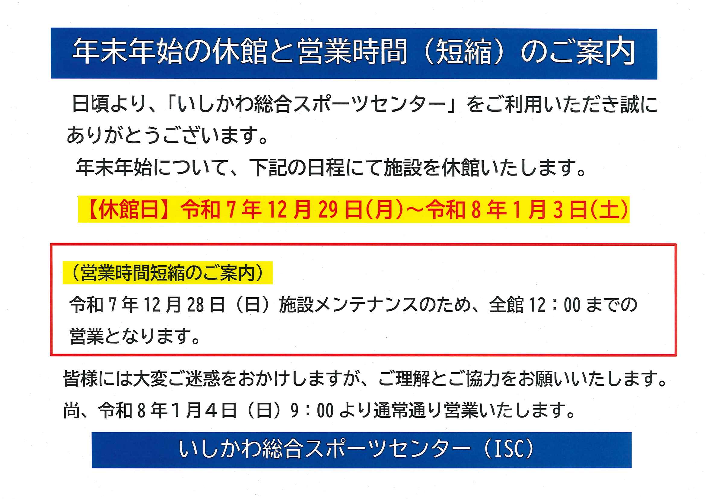 年末年始の施設休館日と営業時間(短縮)のご案内! (11/28)