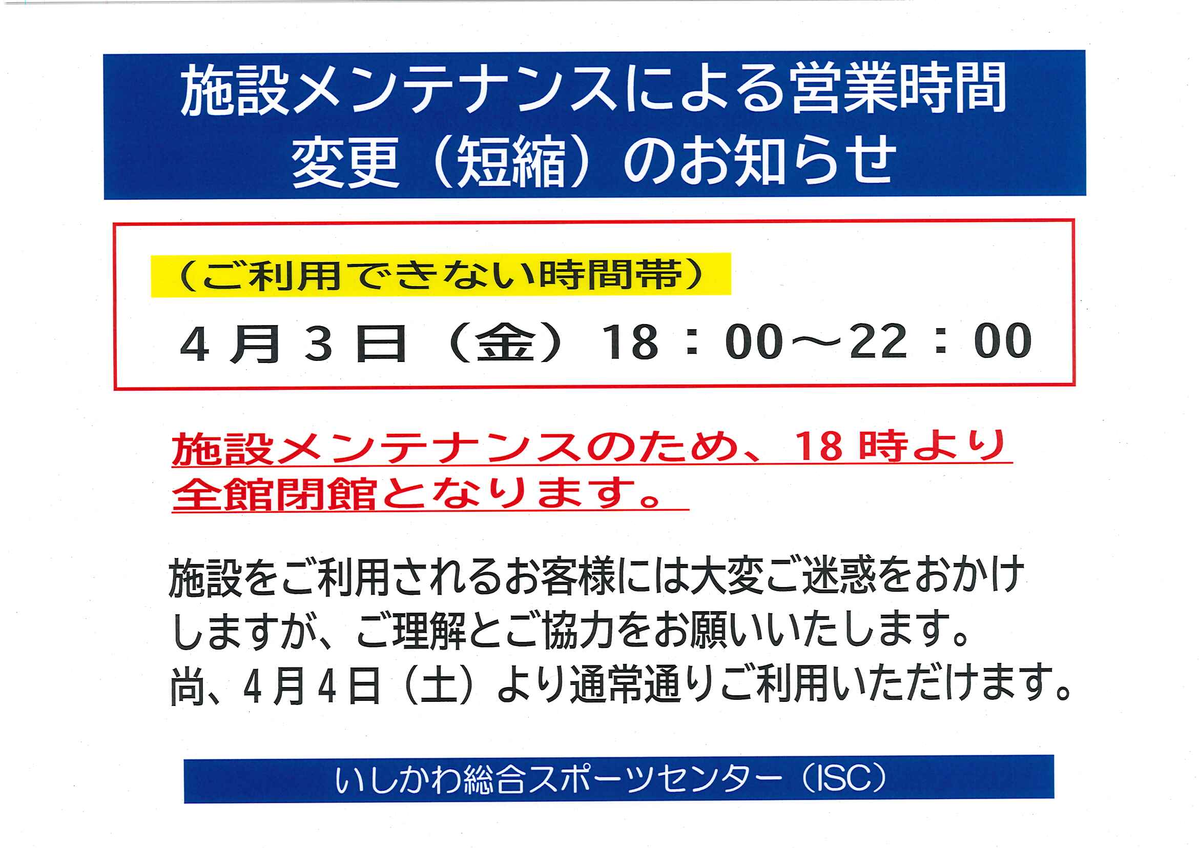 4/3(金)施設メンテナンスによる営業時間変更(短縮)のご案内!