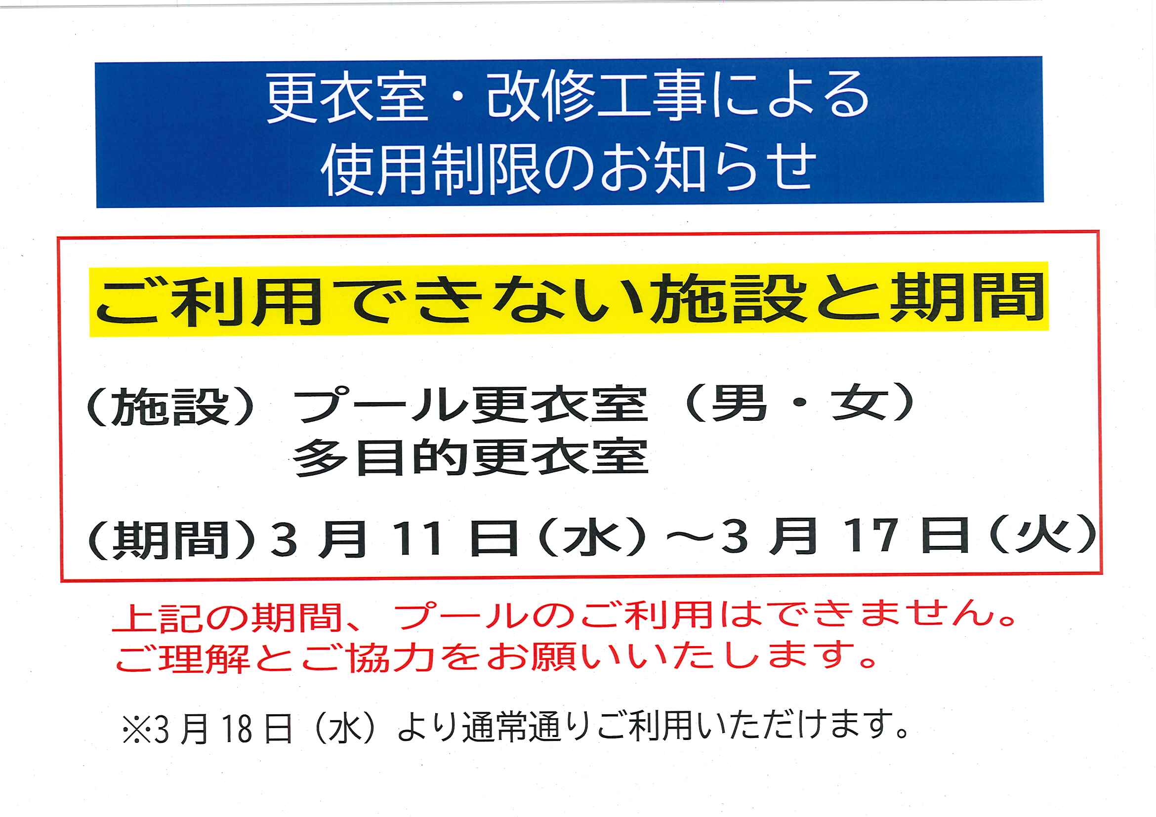 プール更衣室の改修工事による使用制限のご案内! (01/14)
