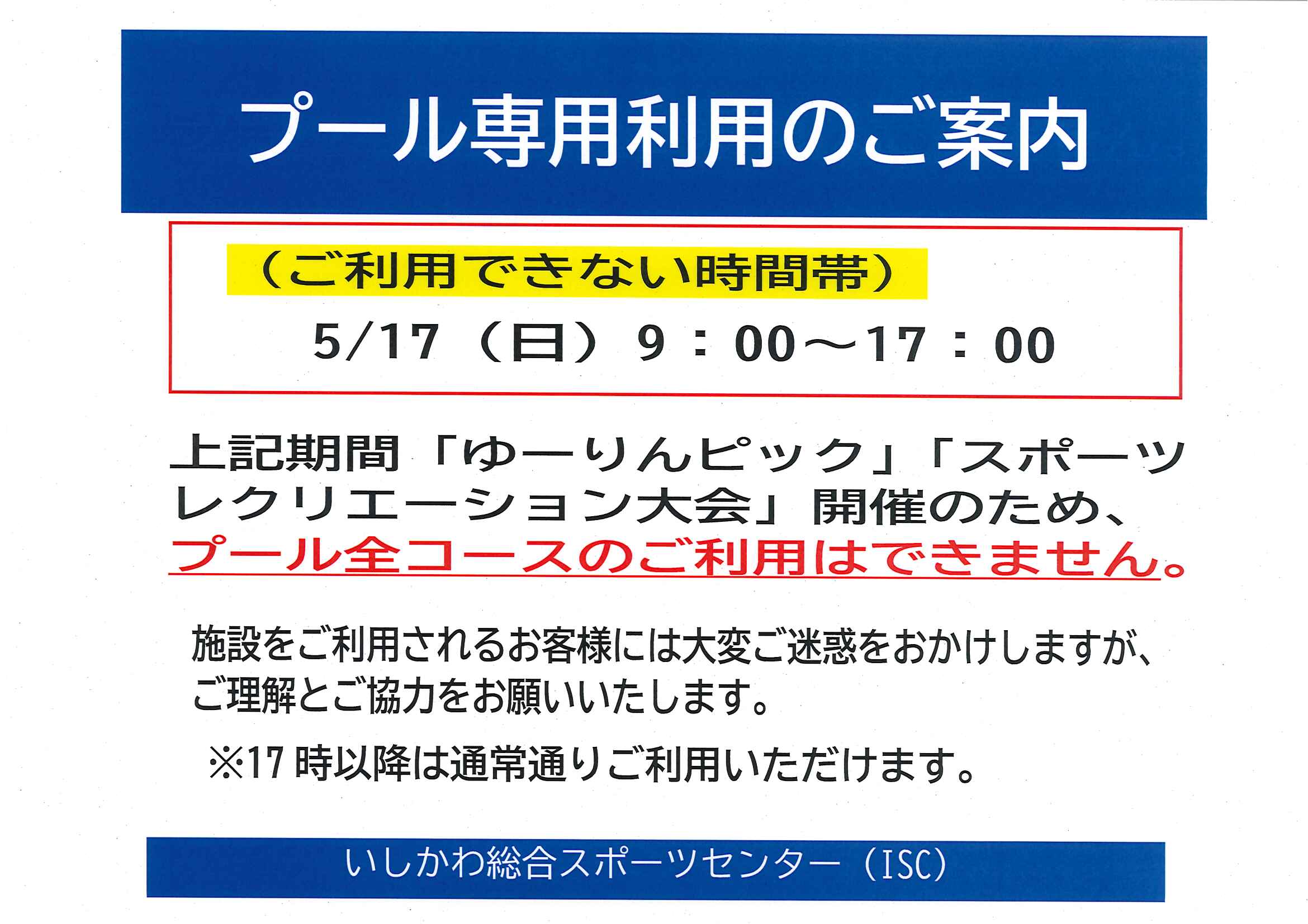 5/17(日)プール専用利用による使用制限のご案内! (04/13)